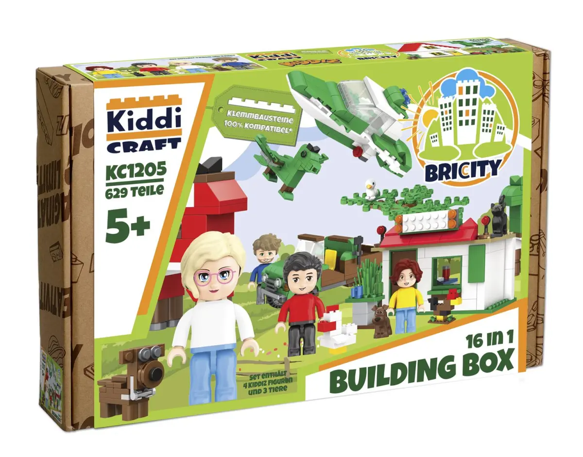 Die Kiddicraft KC1205 Building Box bietet 16 kreative Bauideen mit robusten Steckbausteinen – fördert Fantasie und Motorik ab 5 Jahren.
