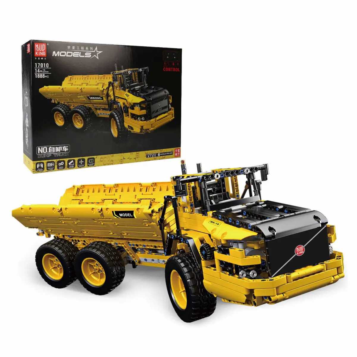 Robuster Mould King 17010 Dump Truck mit RC-Steuerung, 6×6-Antrieb, 1888 Teilen und motorisierter Kippmulde für realistische Baustellen-Action.